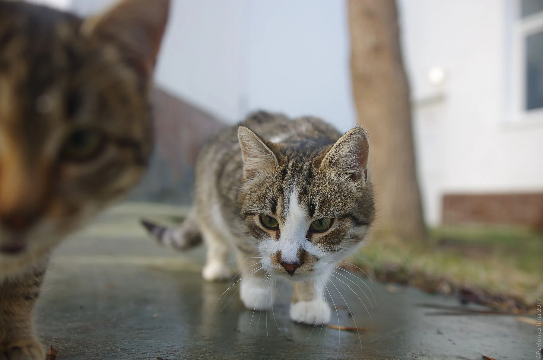 Когда выходишь из столовой, то у корпуса тебя ожидают кошки. Они несколько пугливые, покормить можно, а вот погладить не очень охотно они разрешают